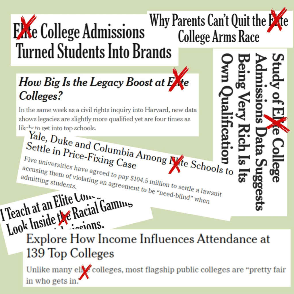 And don’t get me wrong, I’m not a media conspiracy theorist, but the more I learn the more jaded I become. This blog post was motivated by this article in Inside Higher Ed, in which the writer tells the tale of how NYT asked them to write and oped, but had a very particular narrative that they wanted the oped to push. It wasn’t looking for objective journalism, it wanted to frame a narrative. It seemed the editor wanted to reinforce certain beliefs. According to the author, the NYT said they wanted “a piece about selective admissions with the framing that this year an already-crazy system went truly bonkers.” When the author pushed back, offering to reframe the conversation about the more broadly applicable FAFSA crisis they balked and “got someone else to make exactly the argument they wanted.”