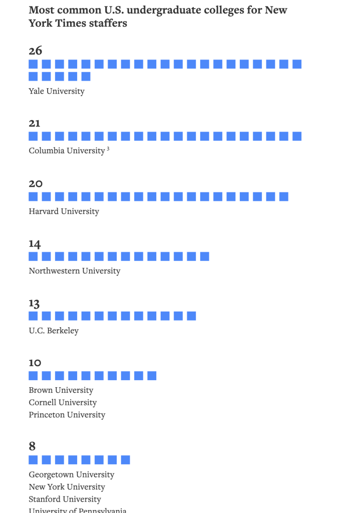 Perhaps what we should be asking is why. Why does the NYT have this bias? Where is journalistic objectivity? Joshua Benton at Nieman Lab, which perhaps ironically is a journalism lab funded by Harvard, explored who works at the NYT and you might not be surprised to see his findings: