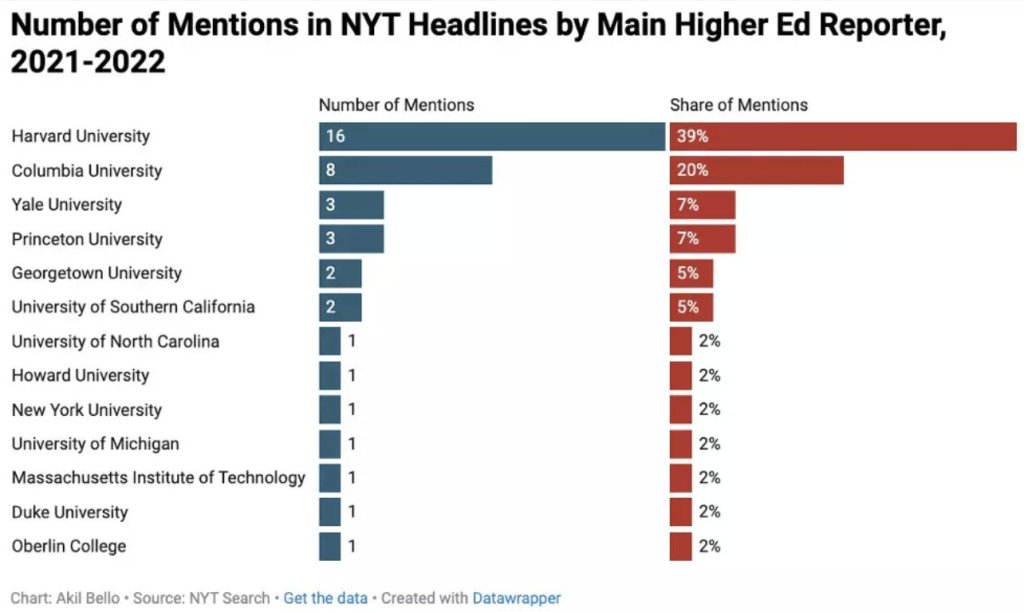 My search in their archives found that they wrote very very very few stories that weren’t about Harvard. In 2022, I tried to quantify this a bit more carefully and made this chart that looked at the headlines in the paper by their primary (they have several) education reporter.
