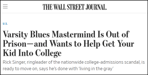 Recently, the main villain behind the Operation Varsity Blues (OVB) scandal was released from federal custody after a brief 16 month stint in minimum security detention and has embarked on a reputation rehabilitation tour. With the cooperation of WSJ, ABC, and others, he’s attempting to relaunch a less illegal version of the same business that led to the massive federal investigation that exposed the networking, influence peddling, philanthropy laundering, fraud, and bribery that wealthy people use to get and keep advantages.