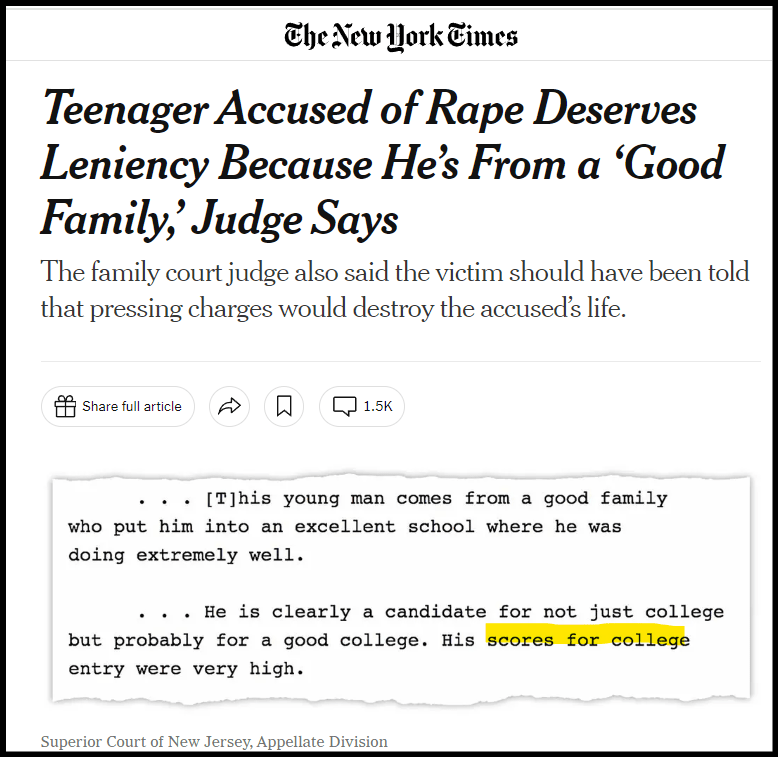 Not to diminish the accomplishment but doing well on the a college admission test is much like winning a Rubik’s Cube competition or the Scripps Spelling Bee. Not many people can do either of those things. I can’t do either of those things. Those things require a type of intelligence, they are difficult, and they require practice to become really good at. The kids who win the Rubik’s Cube competition have unique skills. The kids who win the math Olympiad have a skill with that many don’t. The kids who win the Scripps Spelling Bee are smart and accomplished, but should they be lauded as geniuses? Should they be granted college admissions? Should they be given a more lenient sentence for rape?