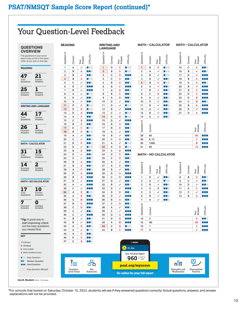 The College Board has actually made the PSAT worse as a practice test in this latest update (kinda just like every Microsoft update). On the PSAT version 21 (the previous version) students got this report with scores: