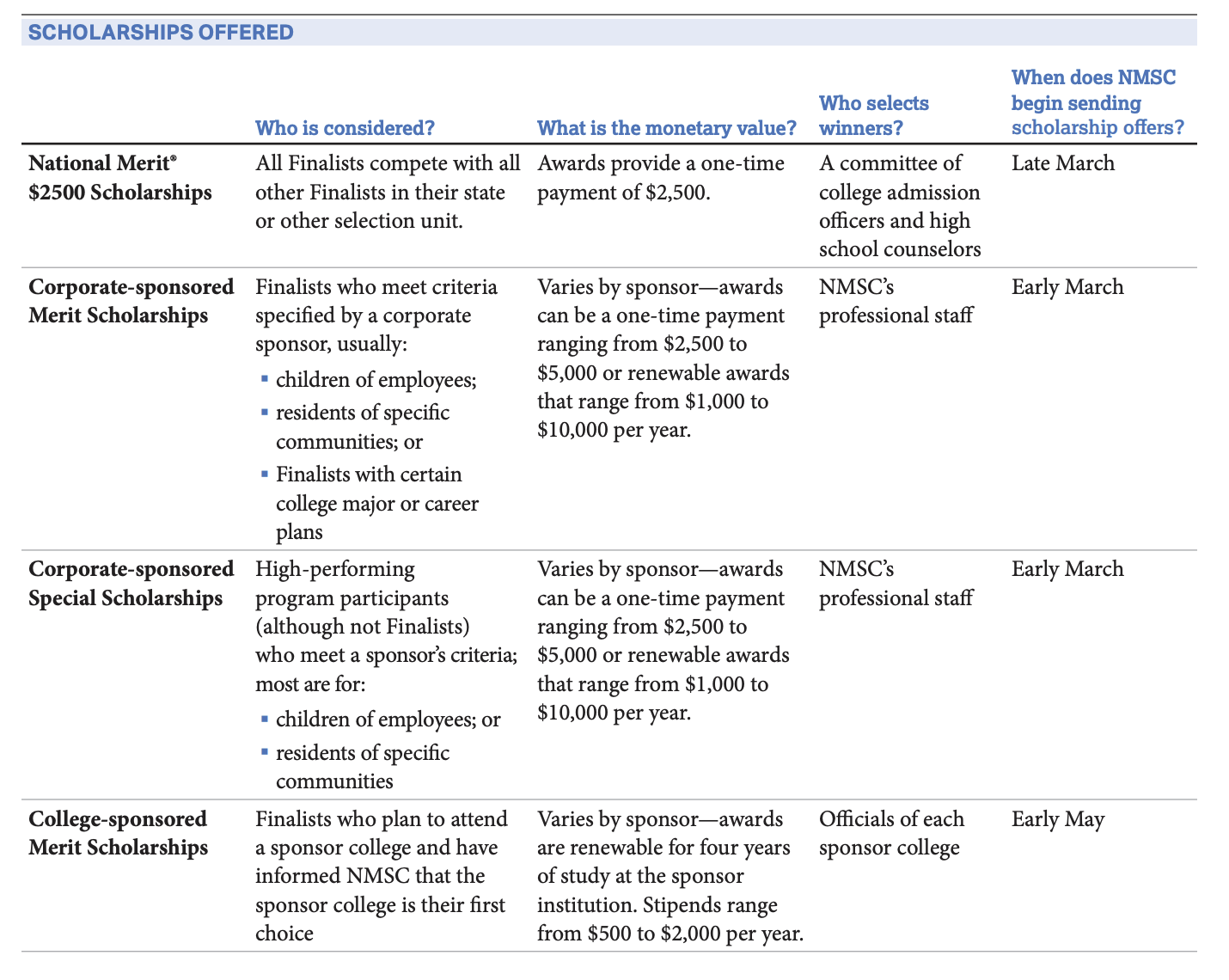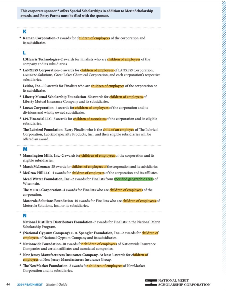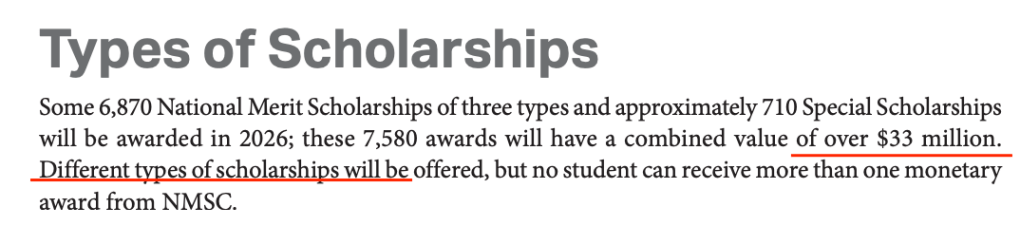 While the marketing tells us the PSAT provides access to tens of millions of dollars in scholarships, the devil’s in the details. If you dig deep enough you find a guide to the Nimsquat that tells you what scholarships they have and who can qualify.