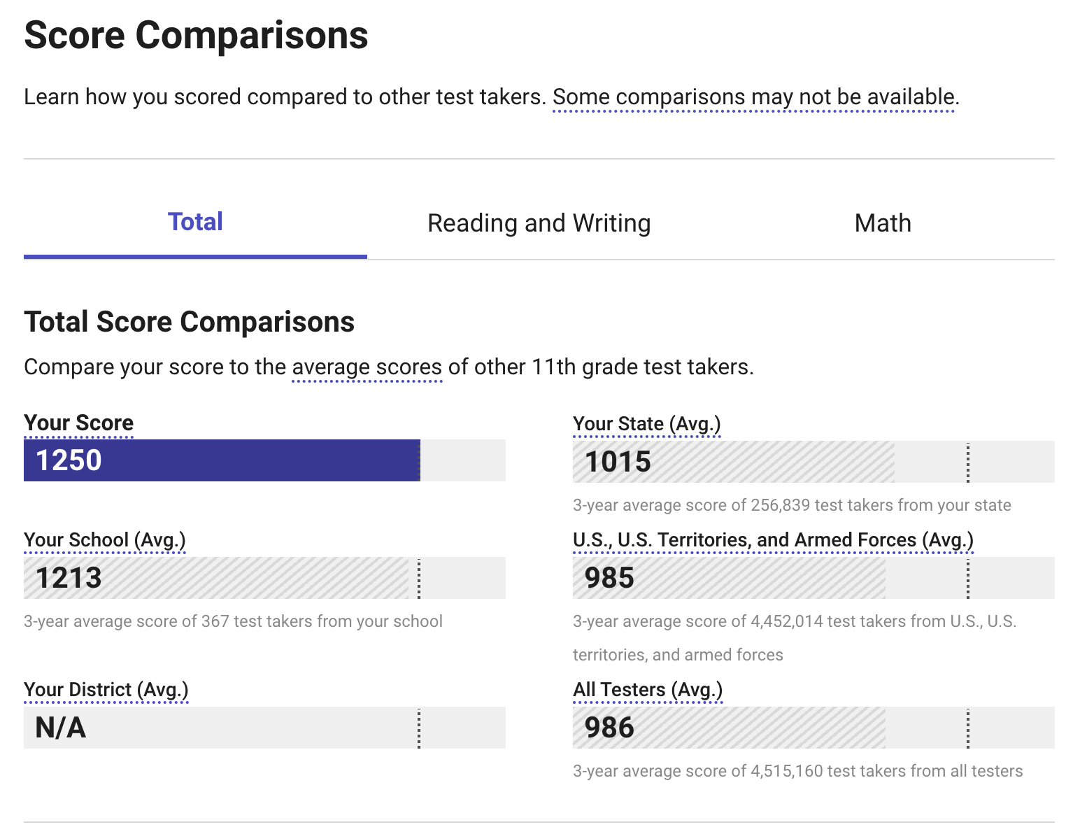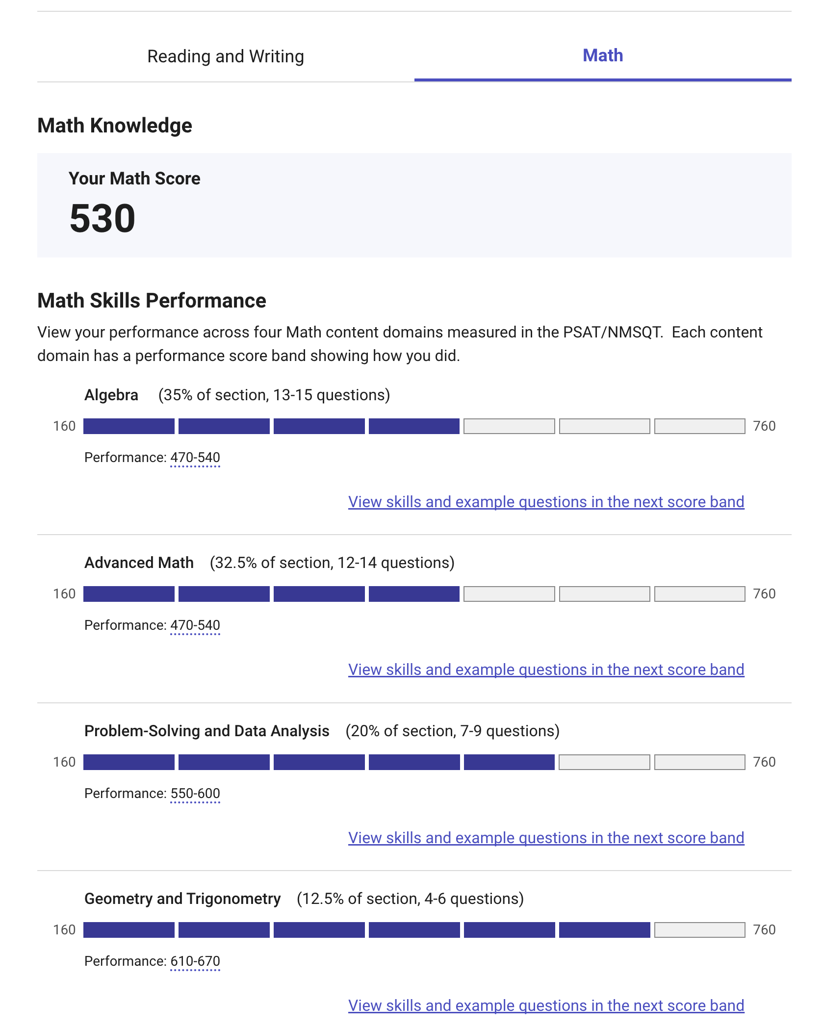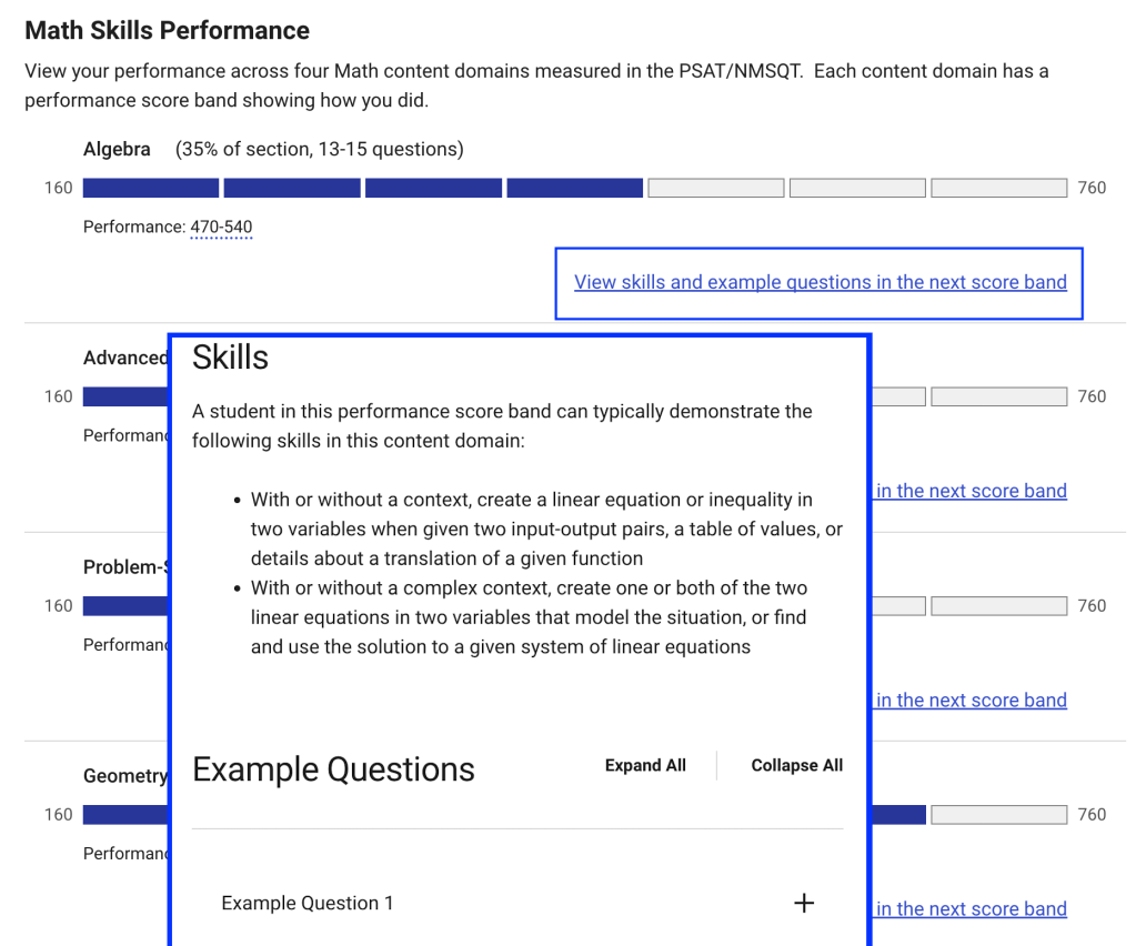So in the image of the Math Skills Performance that student got questions right in the 470 – 540 range for algebra. I don’t know if it means the student got no questions right above that range or if it means that the average of the questions they got right had a difficulty rating in that score range. College Board isn’t clear about that. Needless to say, this is completely unclear from the report, making this whole graph useless or misleading. What makes it worse is that not every score report even shows the numbers, some show “Performance: Easy”, and some show nothing.