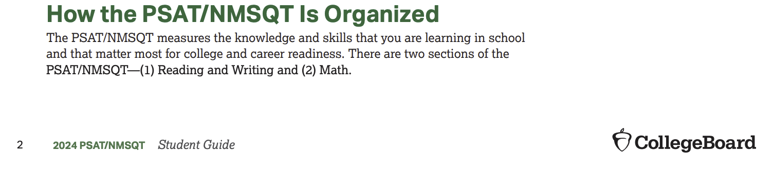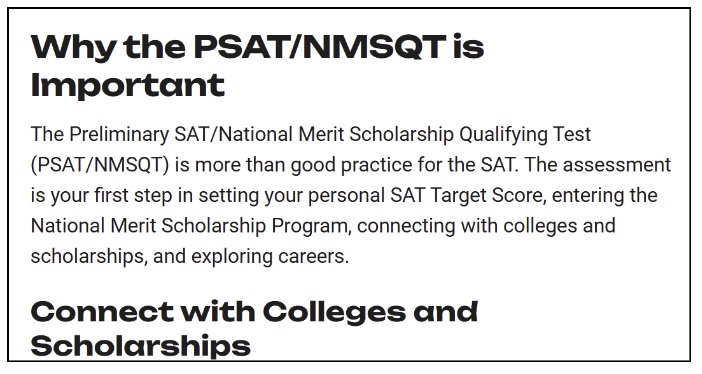 The PSAT, when given in the fall of the 11th grade year, is officially called the PSAT/NMSQT. The NMSQT part of the PSAT/NMSQT means National Merit Scholarship Qualifying Test. You could say it’s a co-branded version of the SAT offered by CB and their partner, the National Merit Scholarship Corporation. It is a qualifier for some scholarships, just not as many as some seem to believe. It’s only used by a relatively small percentage of scholarships. But something is better than nothing. Kinda.