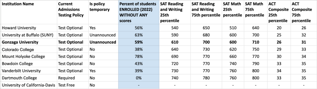 E-M’s scores are well above the international, national, state, and her high school’s averages, and they are above the 25th percentile for Gonzaga, her first choice. Given all these contexts in which her scores are strong, sending them to Gonzaga would not likely hurt the application and might actually help. This is also true at Colorado and probably even Mount Holyoke (though given the percent enrolled without scores at MH, I’d only send if the scores added clear evidence of that her GPA and curriculum didn’t already provide).