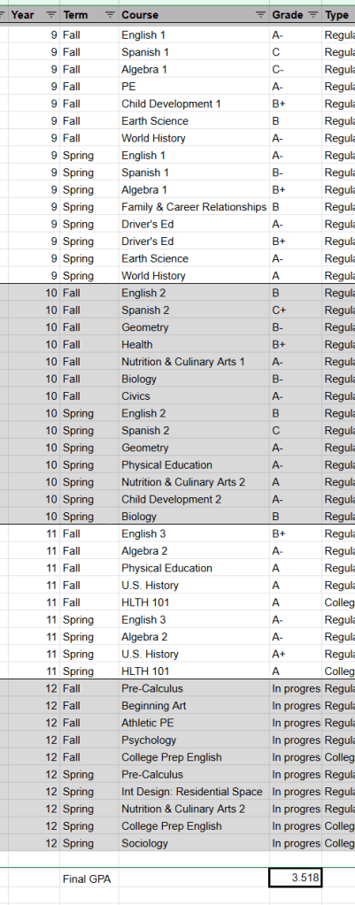 Some colleges, when recalculating GPA, consider 9th grade through the first half of 12th grade. Some will only consider classes from 10th and 11th grades. Some will give extra weight to AP, IB, dual enrollment, honors or other “advanced” classes; others will not. So let’s play this out with a theoretical student. Here’s the transcript of a typical solid student.
